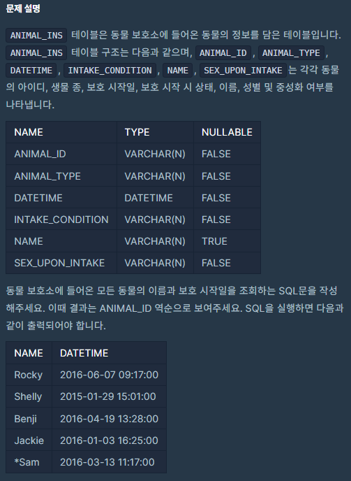 ANIMAL_INS 테이블은 동물 보호소에 들어온 동물의 정보를 담은 테이블입니다. ANIMAL_INS 테이블 구조는 다음과 같으며, ANIMAL_ID, ANIMAL_TYPE, DATETIME, INTAKE_CONDITION, NAME, SEX_UPON_INTAKE는 각각 동물의 아이디