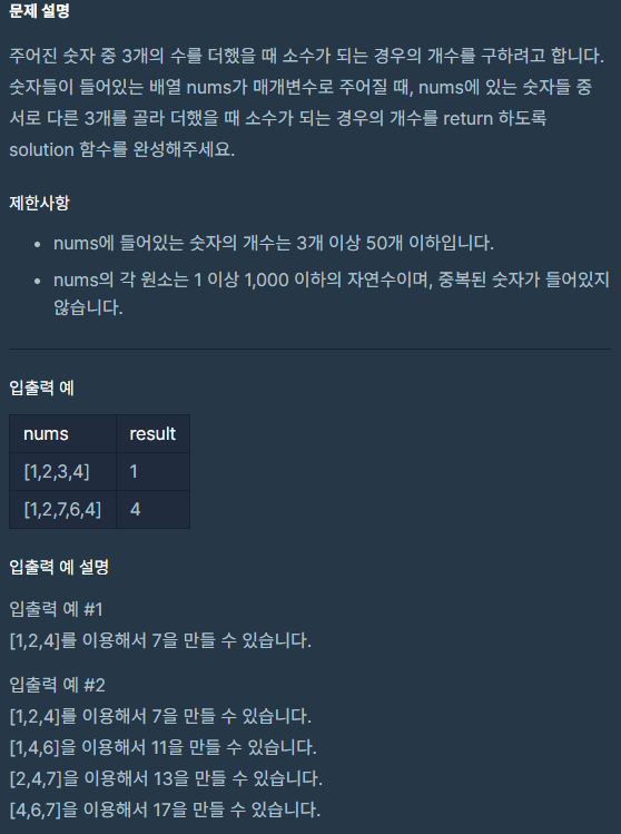 ✔ 문제 포인트 : 소수를 판별하는 것과 리스트에서 3개의 숫자를 조합하는 것