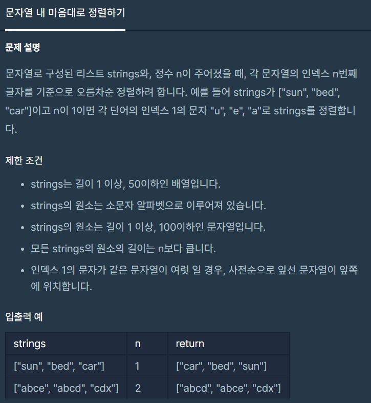 코딩테스트 연습 - 문자열 내 마음대로 정렬하기