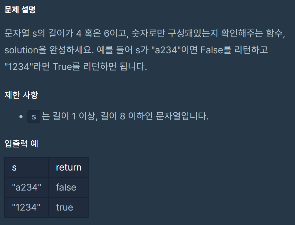 문자열 s의 길이가 4 혹은 6이고, 숫자로만 구성돼있는지 확인해주는 함수, solution을 완성하세요. 예를 들어 s가 "a234"이면 False를 리턴하고 "1234"라면 True를 리턴하면 됩니다. 제한 사항 s는 길이 1